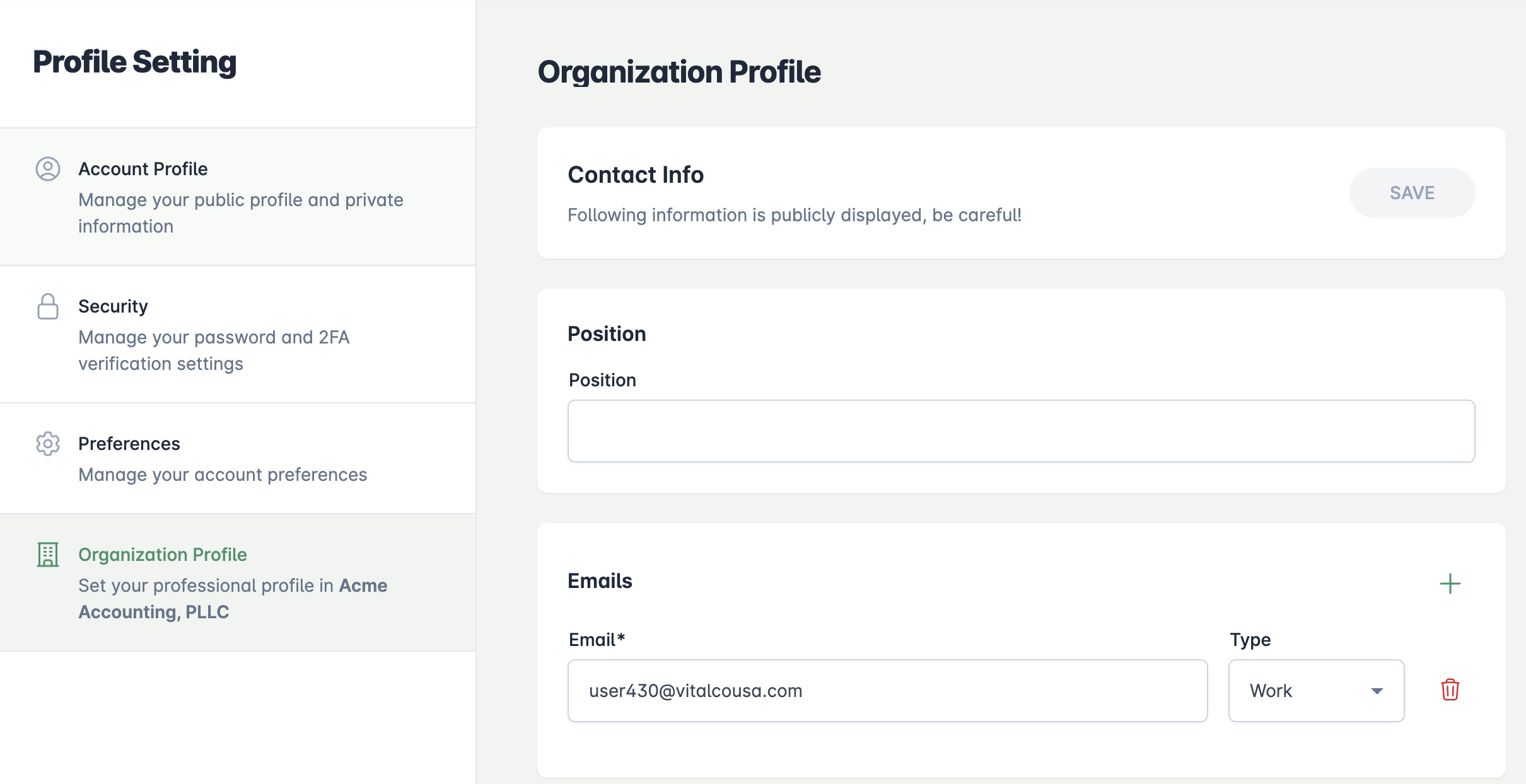 To update your detailed contact information (visible to others), go to the 'Organization Profile' tab.
