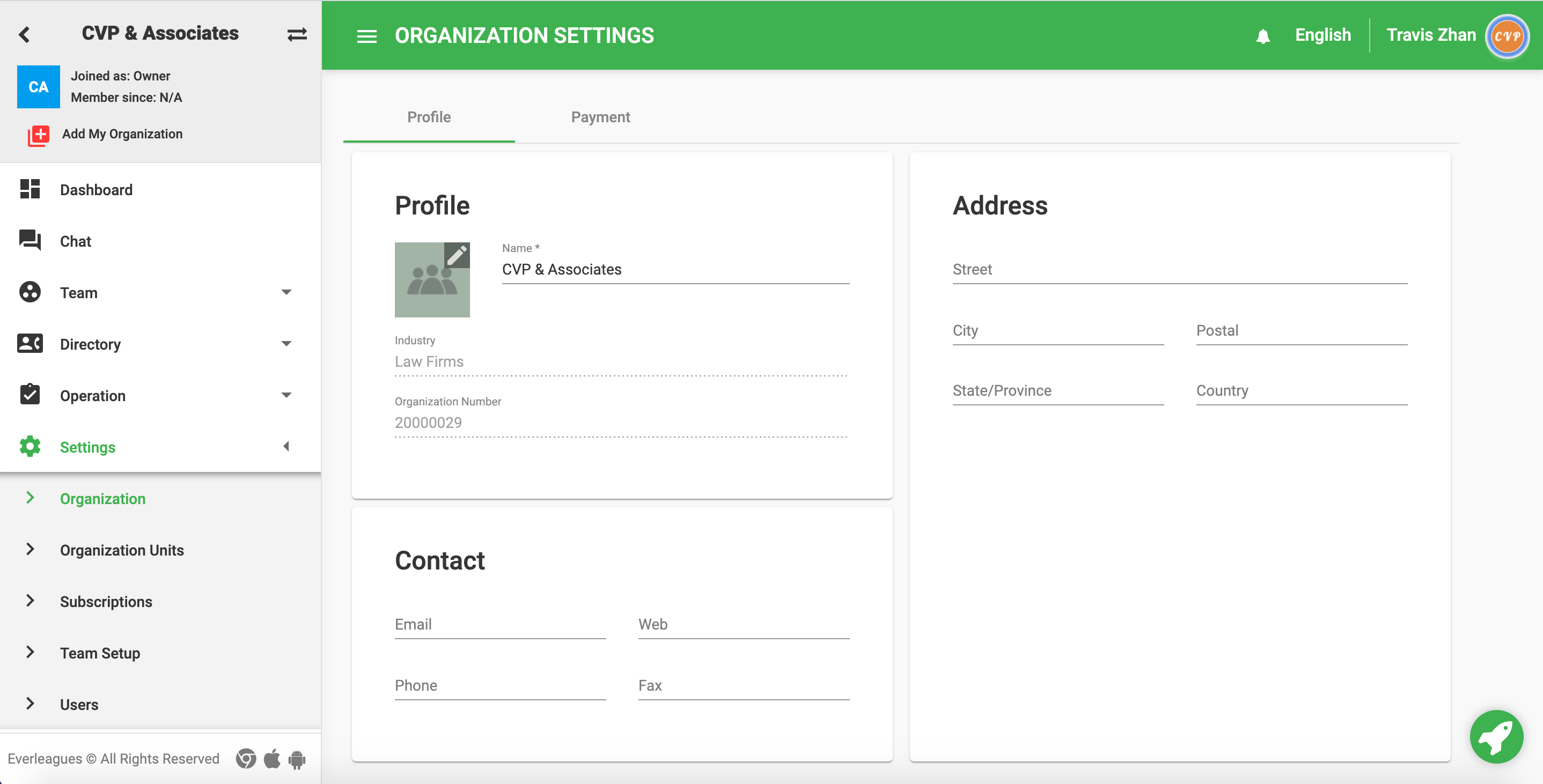 In the Organization Settings panel, you can make changes to your company's address and contact information.